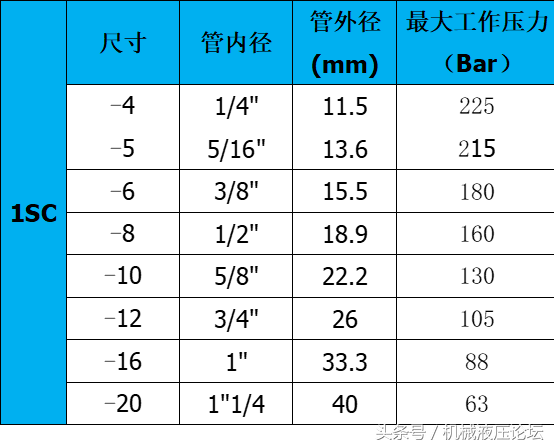 附:常用液壓膠管內外徑及最高工作壓力參數